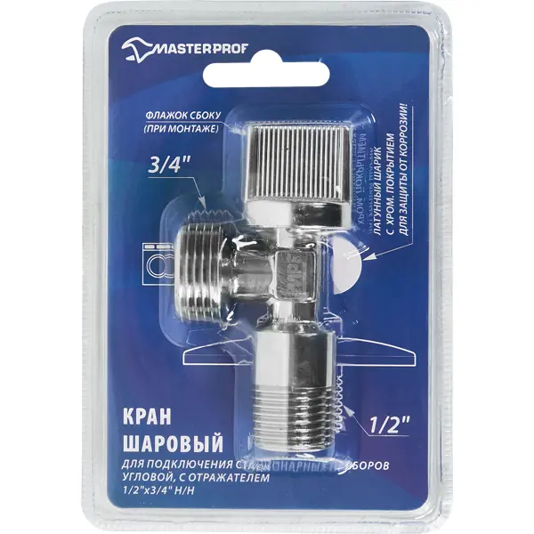 **Кран шаровой Masterprof** углового типа применяется в качестве запорного элемента. Устанавливается на трубу водопроводной системы. Сбоку располагается флажок, обеспечивающий быструю блокировку потока воды. Актуален при проведении ремонта и устранения последствий аварийной ситуации. ### Особенности: - диаметр соединения - 1/2 х 3/4 дюйма; - тип резьбы - наружная.