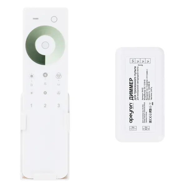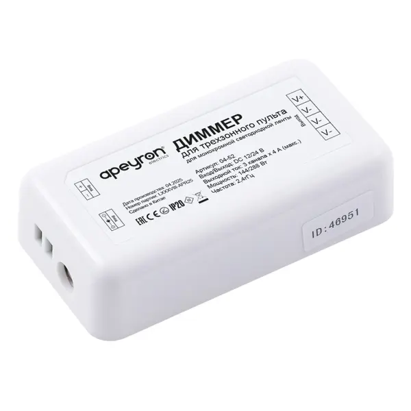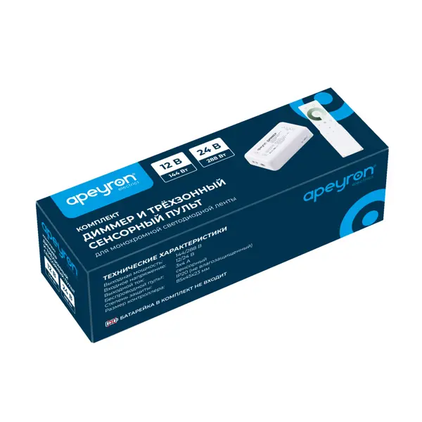 **Диммер Apeyron** для соединения светодиодной одноцветной ленты — специальное устройство, с помощью которого можно регулировать мощность для уменьшения или увеличения яркости источника освещения. Характеризуется простым и надежным механизмом работы. Обладает прочным и износостойким корпусом из пластика — защита от пыли и воды достигает IP20. Удобно ложится в руку и не соскальзывает. Отличается удобным и простым управлением. ### Особенности: - для ленты мощностью 144/288 Вт и напряжением 12/24 В; - небольшой вес — 0,106 кг; - удобство управления и надежность; - длительный эксплуатационный срок; - возможность уменьшения энергопотребления ленты; - регулировка яркости позволяет эксплуатировать приборы в щадящем режиме; - можно создавать и быстро сменять сценарии освещения. Подробнее о том, [**как выбрать и подключить светодиодную ленту**](/advice/osveshtenie/kak-vybrat-i-podklyuchit-svetodiodnuyu-lentu/), читайте в нашей статье. **БЕРЕЖНО К ЛЮДЯМ, БЕРЕЖНО К ПРИРОДЕ** - Этот товар имее