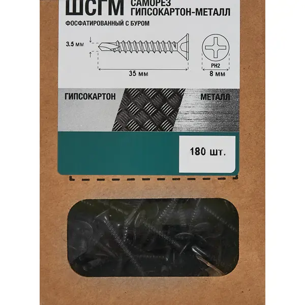 **Саморезы по гипсокартону и металлу фосфатированные** — крепежные изделия с широкой сферой применения. Используются для надежной фиксации отдельных элементов конструкции на листы и профили разного типа. Состоят из стержня с резьбой и потайной головкой. Производятся из стали, которая придает им повышенную прочность и устойчивость к деформации и механическому воздействию. За счет острого наконечника крепеж такого типа быстро проникает в материал, что позволяет выполнить монтаж без необходимости предварительной подготовки отверстия. Особенность таких саморезов заключается в наличии специального покрытия из фосфата, который нанесен тонким слоем. ### Особенности: - размеры — 3,5 х 35 мм; - в упаковке 180 штук; - поверхность окрашена в черный цвет; - широкая сфера применения; - быстрый и простой монтаж за счет заостренной резьбы; - надежная фиксация отдельных деталей; - хорошая устойчивость к деформации и механическому воздействию.