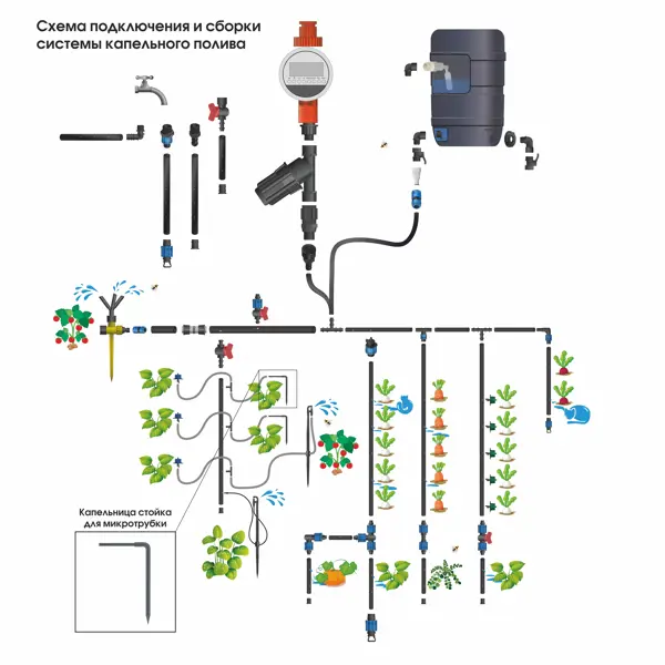 Стойки-капельницы используются при организации системы капельного полива. С помощью микротрубки с внутренним диаметром 3 мм и фитингов 3 мм подключаются к магистральной трубке. Лабиринт капельницы обеспечивает дозированную подачу воды. - Подача воды: самотек до 3,5 бар