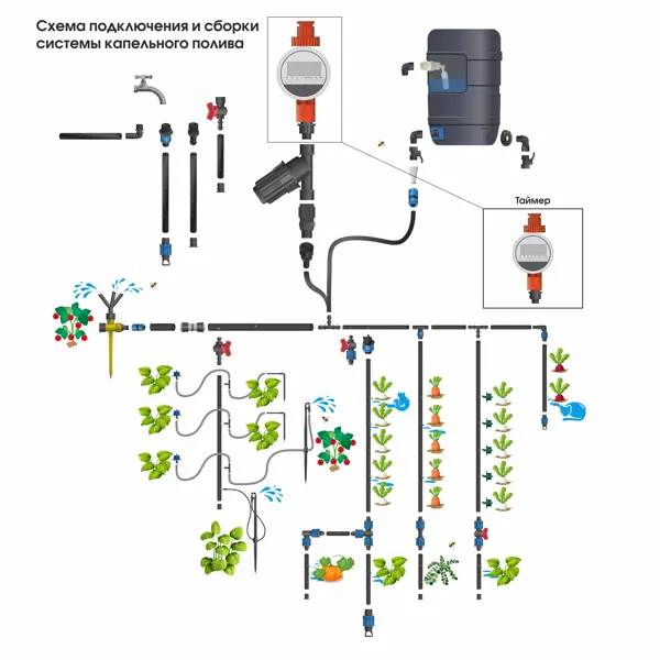 Таймер для полива. Внутри - пластиковый шаровый кран. Используется для полива. Позволяет регулировать время полива от 1 до 120 минут, частоту полива от 1 час до 7 суток. Преимущество шарового крана в том, что позволяет работать с грязной (но без песка) водой. Но при этом недостаток: открывание или запирание происходит в течение 2х секунд, и для надёжной работы обязательно использовать качественные алкалиновые батарейки. **Особенности:** 1. Работает от самотёка от бочки: кран открывается даже если нет воды, поэтому наличие давления совершенно не играет роли. 2. Для управления используется два переключателя. Один регулятор выставляет интервал между включениями. Другой регулятор выставляет длительность полива *внутри* интервала. То есть если выставить *интервал* = 1 час и *длительность* = 10 сек, то таймер будет открываться каждый час. При этом закрываться будет через 10 сек после открывания. 3. Есть также кнопка *отсрочка* - одно нажатие кнопки означает отсрочку на 1 час. Максималь