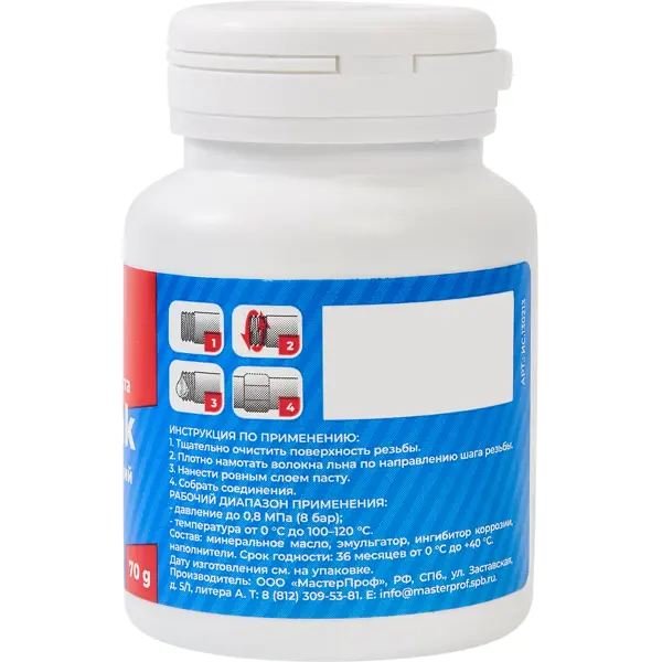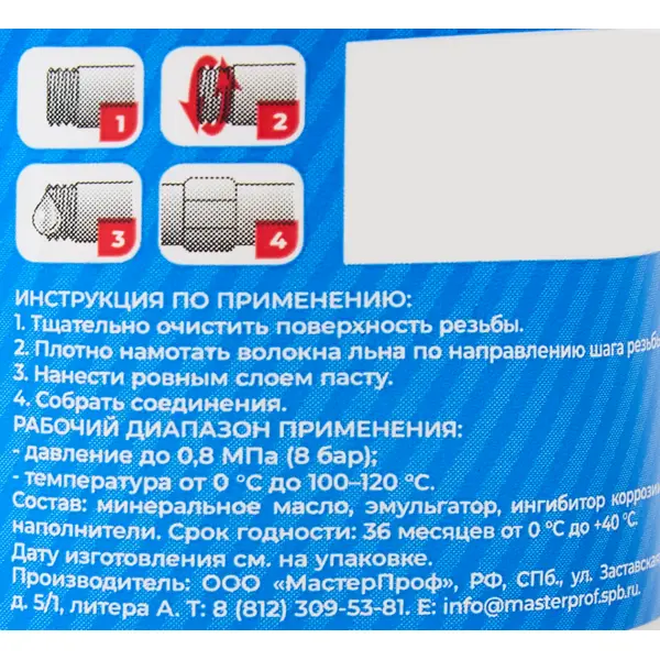 **Паста уплотнительная Masterpak** — состав универсального назначения. Применяется для герметизации резьбовых соединений, обмазки и пропитки льна. Значительно упрощает процесс сборки и последующей разборки узлов, защищает волокна льна разрывов, не позволяет материалу разбухнуть или разложиться под воздействием влаги, пересохнуть и потрескаться при организации соединений в сухих магистралях. Обеспечивает высокую адгезию с металлическими, пластиковыми поверхностями. ### Особенности: - формирует плотное защитное покрытие, защищающее лен от контакта с влагой и воздухом; - не имеет неприятного запаха; - легко отмывается от кожи и инструментов; - вес флакона — 70 г.