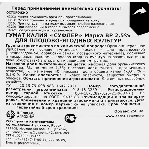 **Удобрение Гумат Калия** используется для корневой и внекорневой подкормки. Средство содержит комплекс полезных для деревьев и кустарников веществ, которые положительно влияют на приживаемость, рост и развитие, повышают урожайность и улучшают вкусовые качества плодов и ягод. Органоминеральное удобрение отличается высоким содержанием гуминовых кислот. Состав: массовая доля органического вещества не менее 1,35%, гумата не менее 40%, общего калия (К.О) 0,5-0,9%. ### Особенности: - предназначение — для плодово-ягодных растений; - объем: 250 мл; - сезон использования — с весны по осень; - подходит для рассады.