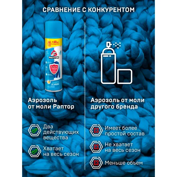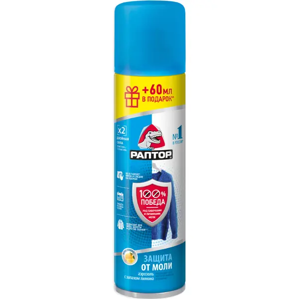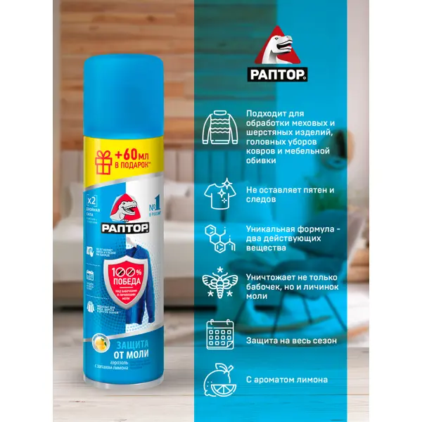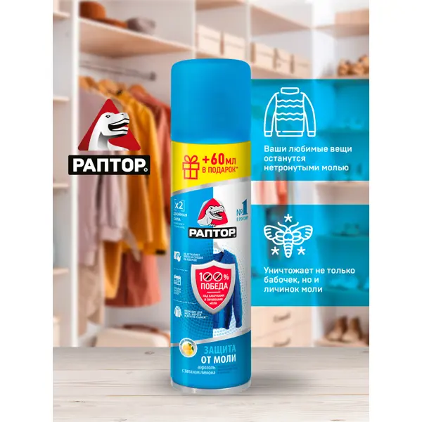 **Средство Раптор** используется для защиты от моли, как бабочек, так и личинок. Подходит для обработки меховых и шерстяных изделий, ковров, мебельной обивки. Распылять средство следует на расстоянии 20-30 см. После нанесения быстро высыхает и не оставляет после себя жирных пятен. Отличается приятным лимонным ароматом. Хранить средство следует вдали от источников открытого огня, в недоступном для детей месте. ### Особенности:
