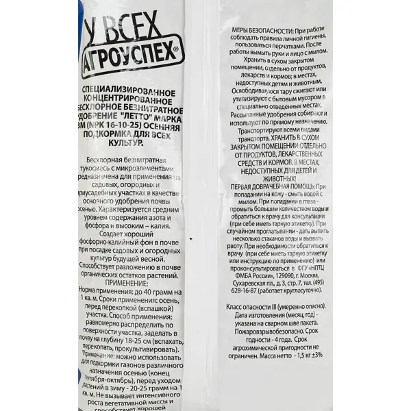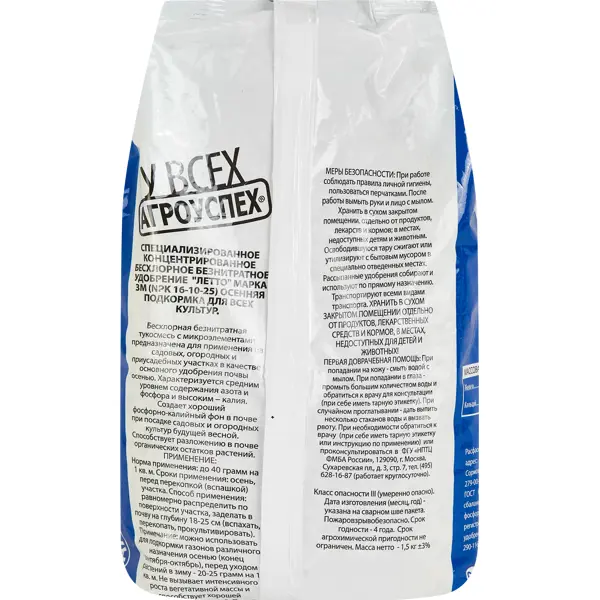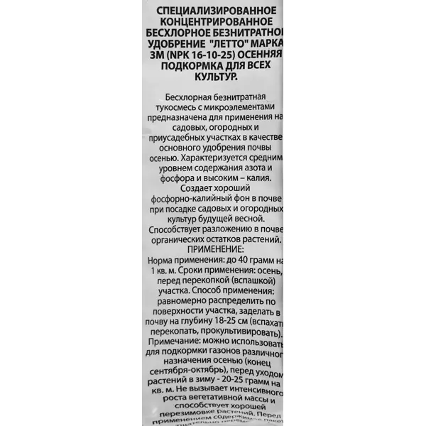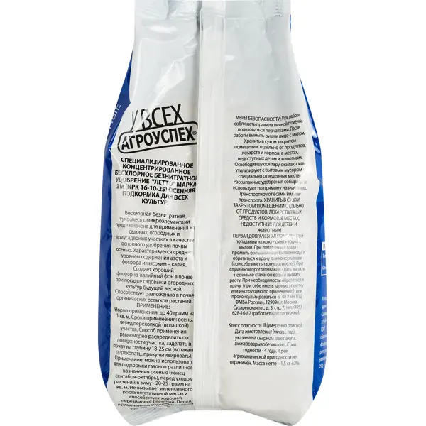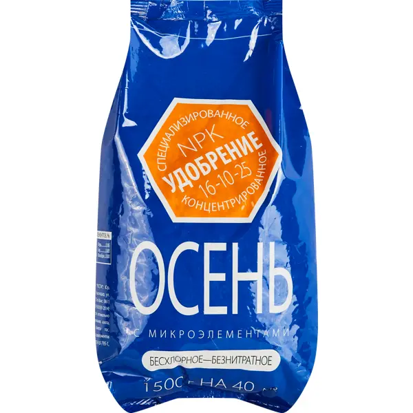 **Удобрение Осеннее** предназначено для подкормки плодовых растений. Это комплексный состав, после применения которого растения легче переносят зимние холода и непогоду. Стимулирует закладку большего количества плодовых почек на следующий вегетационный сезон. Стимулирует иммунные функции деревьев и кустарников. ### Особенности: - подходит для подготовки грядок под овощи на зиму; - может использоваться при весенней перекопке земли под рассаду; - эффективно в качестве питательного вещества для декоративных листопадных и травянистых растений; - в упаковке находится 1,5 кг состава; - состав: P2O5 (фосфор) 5%, K2O (калий) 18%, CaO (кальций) 8%, MgO (магний) 2,5%, S (сера) 12%, другие микроэлементы.
