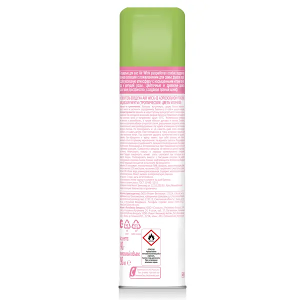 **Освежитель воздуха Air Wick Мальдивские мечты** эффективно борется с неприятными запахами, создавая романтическое настроение с легкими освежающими ароматами тропических цветов и пачули. **Состав:** 15% или более, но менее 30%: пропеллент (смесь бутана, пропана, изобутана); менее 5%: консервант, неионогенные ПАВ, ароматизатор, линалоол. **Правила хранения:** Хранить в недоступном для детей и животных месте. **Правила использования:** Хорошо встряхнуть, держа баллон вертикально, нажать на клапан и распылить содержимое баллона от себя к центру помещения.