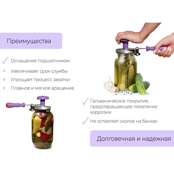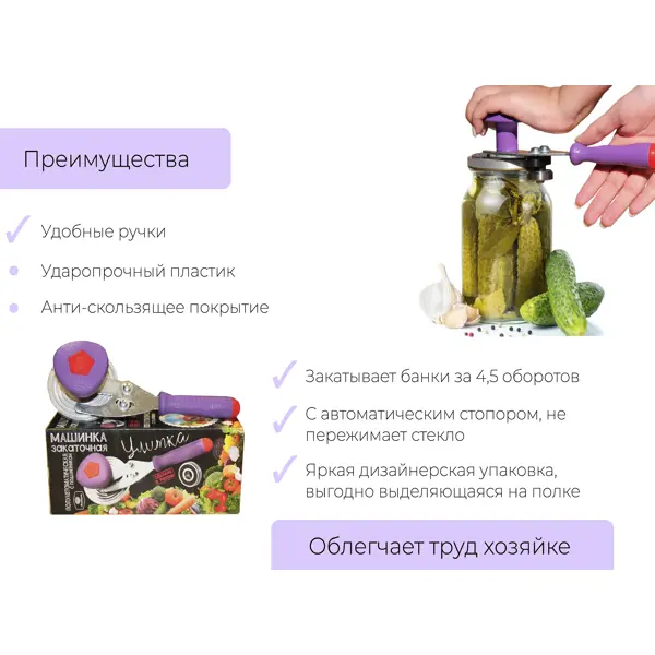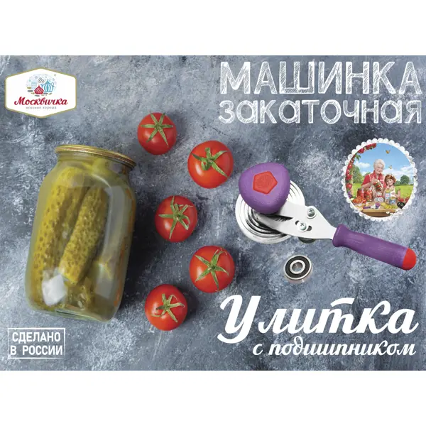 **Машинка закаточная Москвичка Улитка** используется при консервации домашних заготовок — солений, компотов, варенья. Оснащена двумя рукоятками. Одна расположена в верхней части и позволяет плотно прижать крышку к банке. Вторая — сбоку, применяется для закручивания. ### Особенности: - основной материал — сталь; - цвет — фиолетовый.