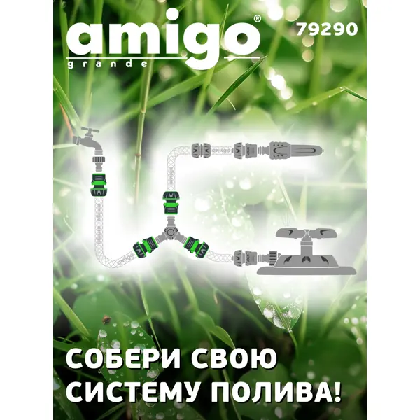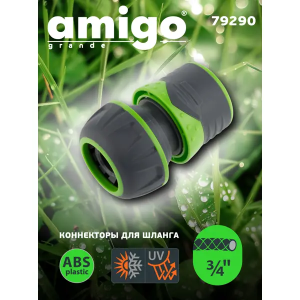 **Коннектор Amigo 79290** представляет собой стандартную модель и используется при обустройстве оросительной системы дачного, загородного участка. Предназначен для подсоединения шланга. Отличается простотой установки и демонтажа. ### Особенности: - присоединительный размер составляет 3/4 дюйма; - материал изготовления — ABS-пластик.
