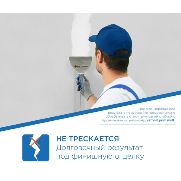 **Шпаклевка гипсовая для швов Гипрок Superflot** — высокопрочный и безусадочный состав, который позволяет тщательно заделать стыки разного типа. Его можно использовать без ленты в кромки ПЛУК и расшитой V-образной кромке. Готовое покрытие не трескается, обеспечивая долговечную основу под финишную отделку. Так как шпаклевка не дает усадки, то поверхность получается ровной и подходящей для дальнейшего нанесения любых материалов. Возможность использования без ленты позволяет сэкономить время и ускорить строительный процесс. Состав является пластичным, то обеспечивает высокий комфорт в работе. При помощи такой шпаклевки можно не только заделывать стыки ГСП, ГВЛ, но также исправлять дефекты на поверхности гипсовых материалов и монтировать декоративные элементы. Для достижения наилучшего результата следует соблюдать технологию нанесения. ### Особенности: - вес продукции — 20 кг; - для внутренних работ в любых типах зданий и сооружений; - белый цвет не просвечивает сквозь финишное покрытие;