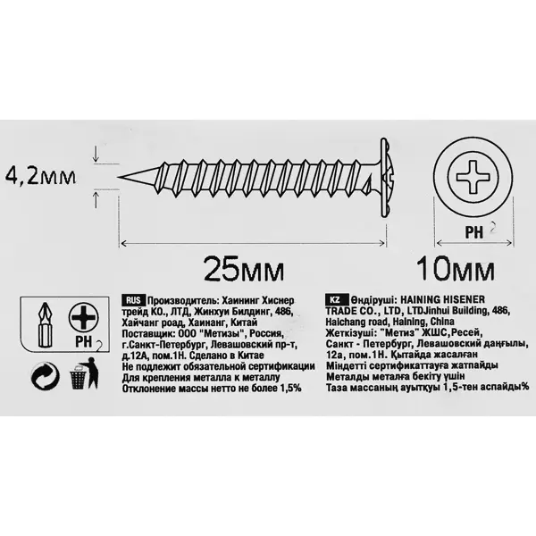 Саморезы по металлу с пресс-шайбой острые фосфатированные 4.2x25 20 шт.