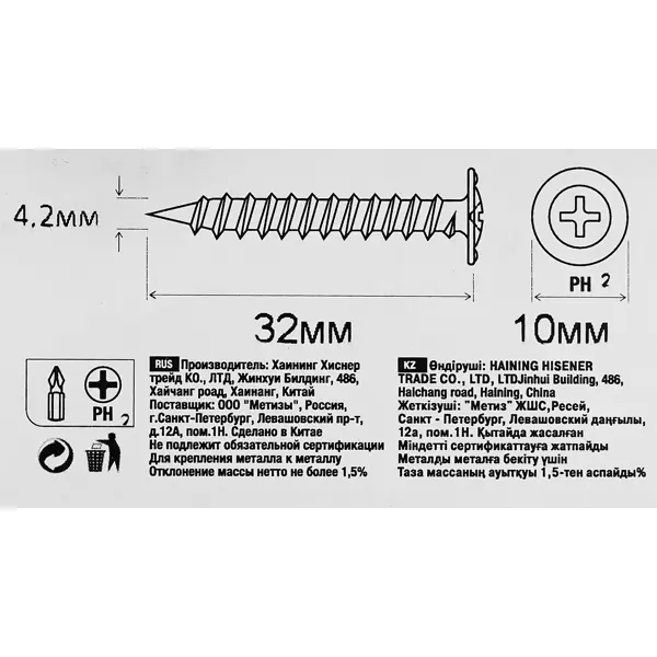 | Размер шлица | PH2 |