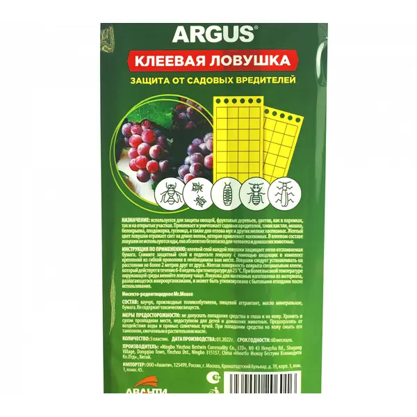 | Инструкция по применению | одвесная клеевая ловушка от садовых вредителей, используется для защиты овощей, фруктовых деревьев, цветов, как в парниках, так и на открытых участках. Привлекает и уничтожает садовых вредителей, таких как тля, мошка, белокрылка, плодожорка, гусеница, а та |