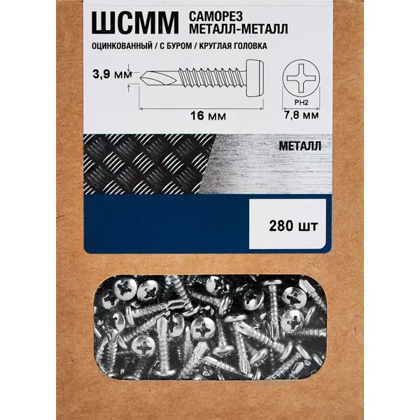 **Саморезы по металлу оцинкованные 3.9x16 мм 280 шт.** используется для крепления различных элементов в металлические основания. Саморезы могут быть использованы для сквозного соединения металлических листов. Наличие бура позволяет обходиться без предварительного сверления. Метиз стальной, оцинкованный, устойчив к коррозии. Для закручивания используется отвертка или шуруповерт с битой PH2. Диаметр — 3,9 мм, длина —16 мм.