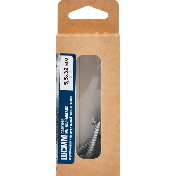 **Саморезы по металлу оцинкованные 5.5x32 мм 8 шт.** с шестигранной головкой используются для закрепления в пластике, в древесине и в тонком металле. Метиз стальной, оцинкованный, устойчив к коррозии. Диаметр — 5,5 мм, длина — 32 мм, размер под ключ 8.
