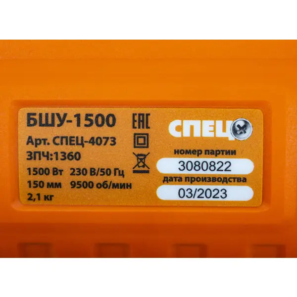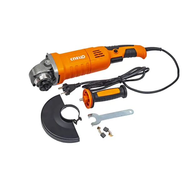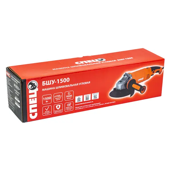 **УШМ (болгарка) Спец БШУ-1500** — угловая шлифовальная машина бытового класса мощностью 1500 Вт. УШМ предназначена для выполнения отрезных и шлифовальных работ по различным материалам. ### Особенности: - Диаметр отрезного круга в 150 мм позволяет производить широкий спектр отрезных работ; - Прорезиненные рукоятки обеспечивают комфорт при работе. - Мощный двигатель с угольными щетками позволяет работать с обдирными дисками при зачистке сварных швов, ошкуривании старой краски с деревянных поверхностей. - Рядом с пусковым курком расположен предохранитель от случайного пуска инструмента. - Смена положения защитного кожуха производится с помощью ключа.