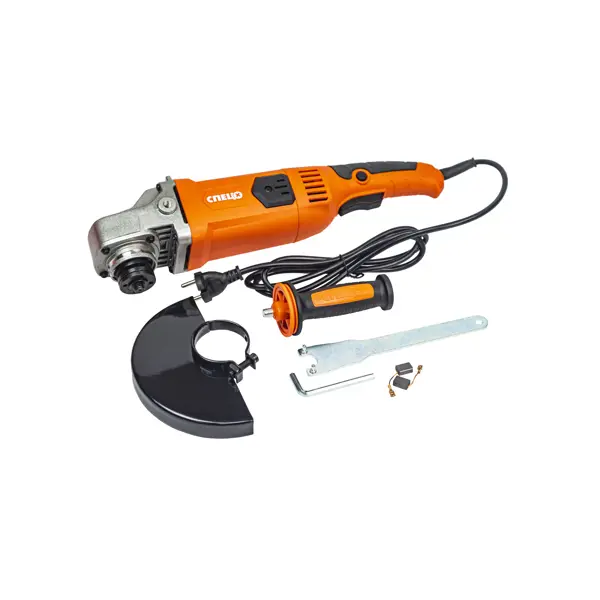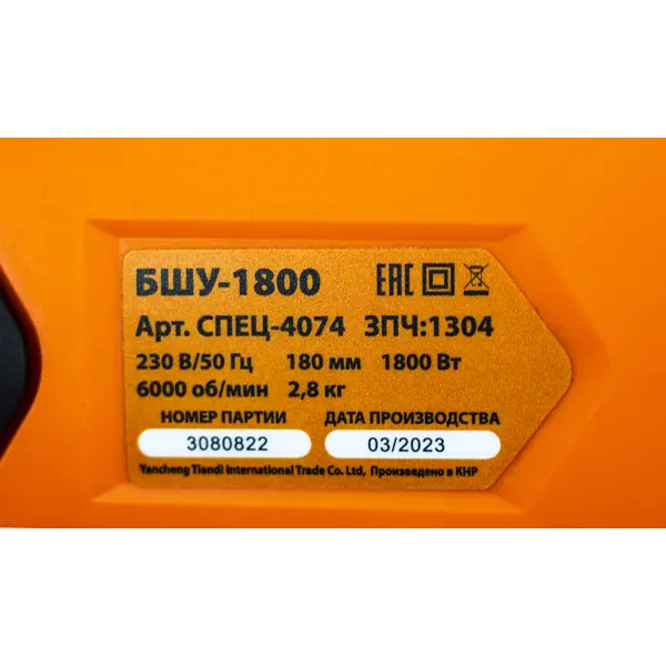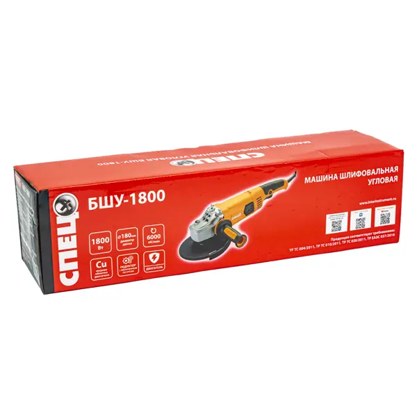 **УШМ (болгарка) Спец БШУ-1800** — угловая шлифовальная машина бытового класса мощностью 1800 Вт. УШМ предназначена для выполнения отрезных и шлифовальных работ по различным материалам. ### Особенности: - Диаметр отрезного круга в 180 мм позволяет производить широкий спектр отрезных работ; - Прорезиненные рукоятки обеспечивают комфорт при работе. - Мощный двигатель с угольными щетками позволяет работать с обдирными дисками при зачистке сварных швов, ошкуривании старой краски с деревянных поверхностей. - Рядом с пусковым курком расположен предохранитель от случайного пуска инструмента. - Смена положения защитного кожуха производится с помощью ключа.