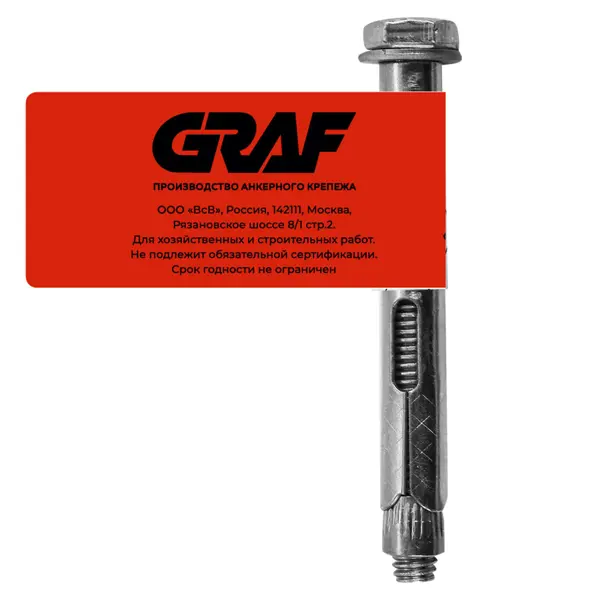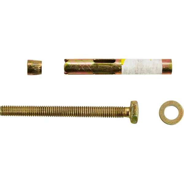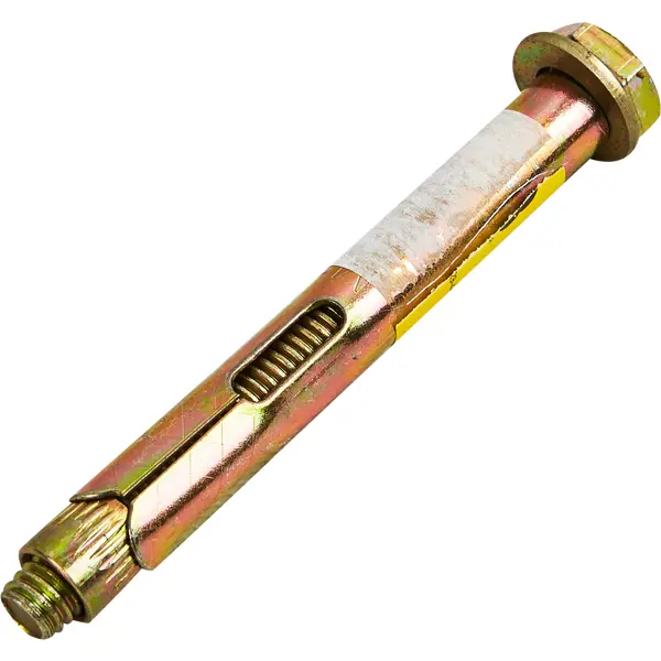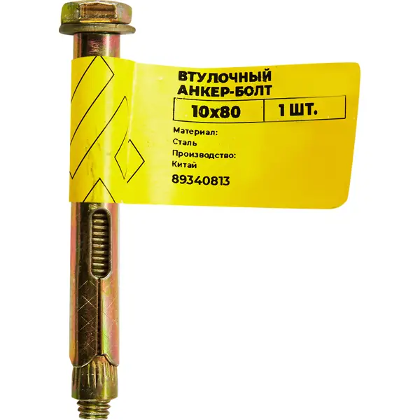 **Втулочный анкер-болт ВСВ** предназначен для крепления самонесущих, тяжелых, монтажных конструкций, фасадных систем и стоек ограждения к полнотелым основаниям. Изготовлен из оцинкованной стали желтого цвета. Конструкция включает усиленную гильзу с насечкой для фиксации, шпильку с шестигранным болтом с направленными насечками для прочного удержания навеса. ### Особенности: - размеры изделия составляют 10 x 80 мм; - шлиц без головки.
