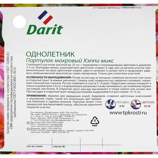 Портулак махровый Хэппи мик, однолетник. Стелющиеся растение высотой до 20 см. С махровыми и полумахровыми цветками в диаметре 2-3 см. Благодаря ярким, разноцветным цветочкам создает в саду или на дачном участке привлекательный пестрый цветочный коврик. Цвести начинает в начале лета и продолжает радовать необыкновенной красотой до самых заморозков. Только для солнечных участков. Особенности выращивания: посев на рассаду (в холодных северных регионах) или в открытый грунт (в южных регионах). Семена сеют поверхностно, умеренно поливают, вают пленкой или стеклом. Ростки появляются спустя 5-14 дней. Подросшие сеянцы пикируют в емкости диаметром 5-6 см, и в дальнейшем увлажняют почву минимально, до появления первых настоящих листочков. В открытый грунт рассаду высаживают в конце апреля или начале мая. При высадке в открытый грунт между растениями выдерживается расстояние 10-15 см.