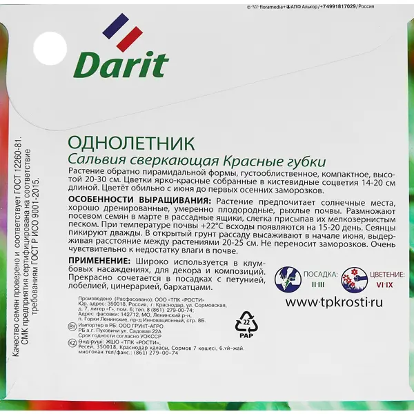 Сальвия сверкающая Красные губки, однолетник. Растение обратно пирамидальной формы, густооблиственное, компактное, высотой 20-30 см. Цветки ярко-красные собранные в кистевидные соцветия 14-20 см длиной. Цветёт обильно с июня до первых осенних заморозков. Особенности выращивания: растение предпочитает солнечные места, хорошо дренированные, умеренно плодородные, рыхлые почвы. размножают посевом семян в марте в рассадные ящики, слегка присыпав их мелкозернистым песком. При температуре почвы +22°С всходы появляются на 15-20 день. Сеянцы пикируют дважды. в открытый грунт рассаду высаживают в начале июня, выдерживая расстояние между растениями 20-25 см. не переносит заморозков. Очень чувствительно к недостатку влаги в почве. Применение: широко используется в клумбовых насаждениях, для декора и композиций. Прекрасно сочетается в посадках с петунией, лобелией, цинерарией, бархатцами.
