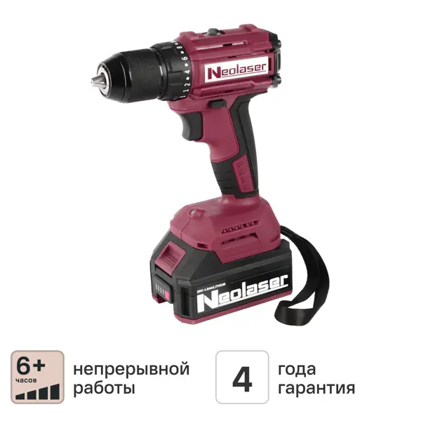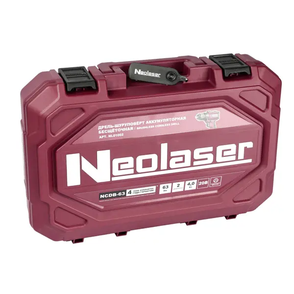 **Высокопроизводительная компактная дрель-шуруповерт Neolaser NCDB-63** идеальна для выполнения тяжёлых работ в ограниченном пространстве. Напряжение аккумулятора 20 В и емкость батареи 4 А*ч обеспечивают высокий уровень автономности и позволяют полноценно работать там, где нет доступа к розетке. Цельнометаллический самоконтрящийся патрон отвечает за надёжное удержание оснастки и быструю её замену. А нижнее расположение подсветки способствует комфортной работе в условиях низкой освещённости. **Аккумуляторы подходят к инструментам серии LXT 18V.** Аккумуляторная дрель Neolaser NCDB-63 - это сочетание высокой мощности и компактного размера. Конструкция инструмента обеспечивает высочайший уровень удобства оператора во время работы. ### Преимущества: - Гарантия 4 года (при регистрации инструмента на сайте производителя в течение 4-х недель с момента покупки); - Напряжение 20 В и ёмкость батарей в 4 А*ч обеспечивают длительную работу без подзарядки; - Два аккумулятора в комплекте обеспе