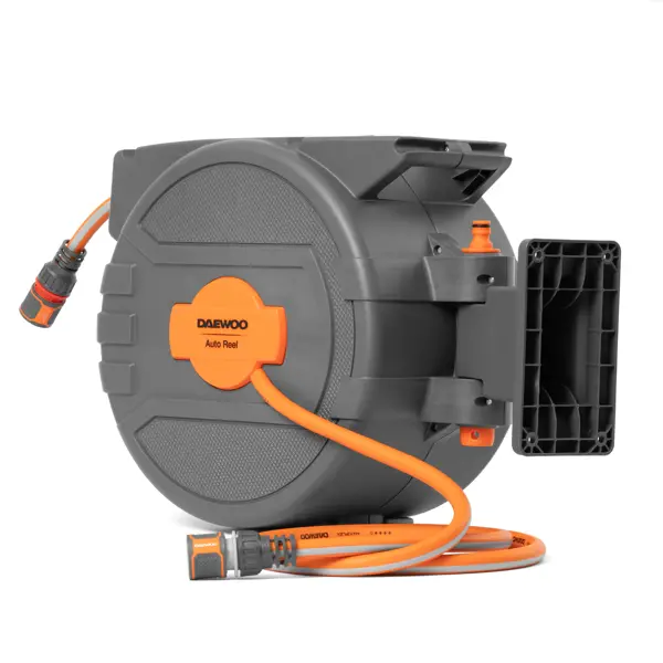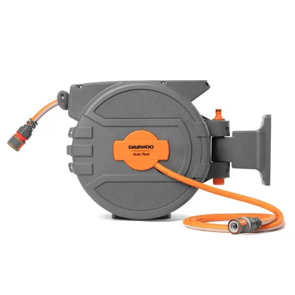 Автоматическая катушка DAEWOO DWR 3050 оснащена 25м шланга DAEWOO MaxiFlex, который отлично противостоит заломам и перекручиванию. Он остается гибким и не деформируется благодаря диагональному текстильному армированию и качественному ПВХ. Механизм автоматической смотки позволяет убрать шланг быстро и равномерно, а специальный стоппер защитит шланг от полной смотки внутрь катушки. Длину шланга легко контролировать, лишь слегка потянув его на себя для фиксации. Благодаря надежному поворотному (180°) кронштейну катушку можно разместить на стене. В комплект поставки входят все аксессуары, которые могут понадобиться для быстрого начала работы. **Система автоматической смотки шланга:** - Шланг сматывается в катушку быстро и равномерно, без заломов или перекручивания. Длину шланга легко контролировать, лишь потянув его на себя для фиксации. - Защитный стоппер: -- Специальный стоппер препятствует полной смотки шланга внутрь катушки. - Надежный поворотный кронштейн: -- Поворотный кронштейн