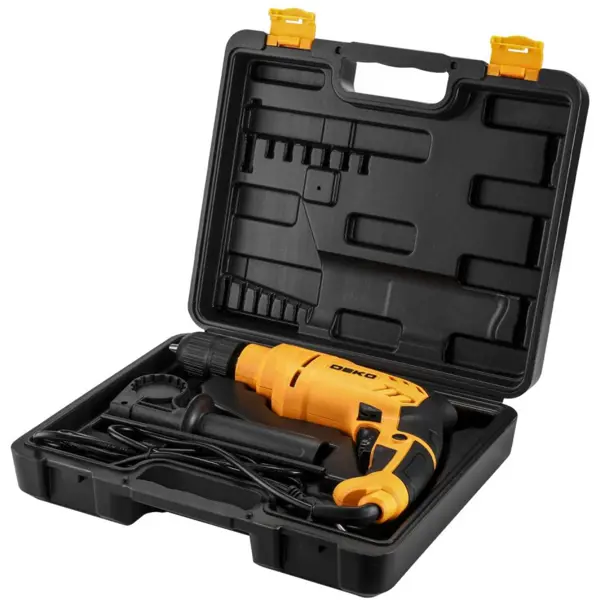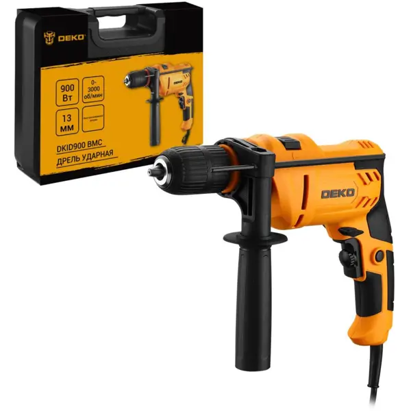 **Дрель-шуруповерт Deko DKID900** — это надежный и удобный инструмент, который позволяет выполнять различные виды работ по сверлению и закручиванию шурупов. Он оснащен мощным двигателем мощностью 900 Вт, что обеспечивает высокую производительность и эффективность работы. Этот инструмент имеет функцию ударного сверления, что позволяет легко пробивать отверстия в твердых материалах, таких как бетон и кирпич. С помощью регулируемой скорости вращения и реверсивной функции можно легко контролировать процесс работы и выбирать необходимый режим в зависимости от задачи. Дрель-шуруповерт оснащена удобной эргономичной рукояткой, что обеспечивает комфортное и безопасное использование инструмента. Также она имеет удобный патрон с быстросменной системой, что упрощает и ускоряет процесс замены оснастки. Это отличный выбор для выполнения различных строительных и ремонтных работ как в домашних условиях, так и в профессиональной сфере. ### Особенности: - подключается к сети переменного тока 220 В; - м