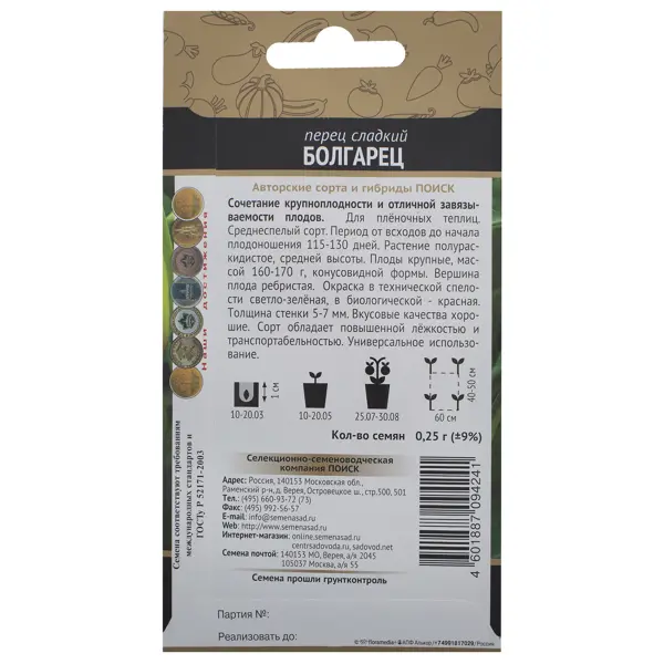 **Семена Перец сладкий «Болгарец»** — среднеранний сорт. Высевается на рассаду в феврале, в грунт пересаживается в конце мая. От первых всходов до начала сбора урожая проходит в среднем 115-130 суток. Отличается средним ростом — не превышает 0,7 м. Листья темно-зеленого цвета, размер — средний. Растение подвергают формовке в виде удаления боковых побегов, а также листочков до первой развилки. ### Особенности: - предназначен для выращивания в теплицах и открытом грунте; - плоды обладают формой конуса, вкус мякоти — сладковатый; - в фазе биологической спелости перец окрашивается в красный цвет; - масса — до 0,18 кг; - использование — в свежем виде, консервации и для заморозки.