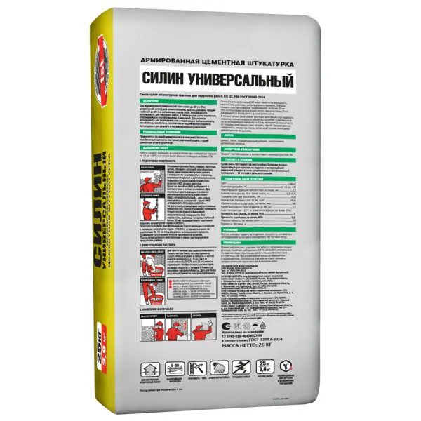 **Штукатурка цементная Unis «Силин»** — универсальная строительная смесь. Используется при отделке фасадов, для выравнивания стен и потолков. Состав также применяется для заделывания дефектов: сколов, трещин и выбоин глубиной до 6 см. Эффективно компенсирует неровности и перепады основания. Смесь применима при создании перегородок и стен из газосиликата, газо- и пенобетона, кирпича. Подходит для внутренних и наружных работ. Температура использования — от +5 до +30 °С. ### Особенности - Состав влагостойкий и морозоустойчивый. После застывания не дает усадку и не образует трещин. - Для замеса раствора из 25 кг смеси потребуется 4,25-5,25 литров воды. Расход материала — 25 кг на 3,5 мм^2^. - Допускается использование смеси при ремонтных работах в детских и медицинских учреждениях, отапливаемых и неотапливаемых помещениях.