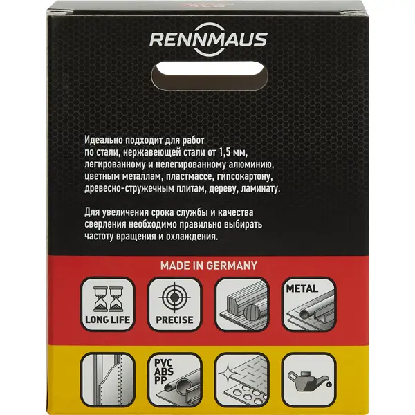**Коронка Rennmaus** предназначена для работ по дереву, стали, легированному и нелегированному алюминию, цветным металлам, пластику, гипсокартону, древесно-стружечным плитам, дереву, ламинату. Применяется в электромонтажных, сантехнических, монтажных работах. За счет утолщенной крышки значительно снижается вибрация, а плотные стенки продлевают срок службы изделия. ### Особенности: