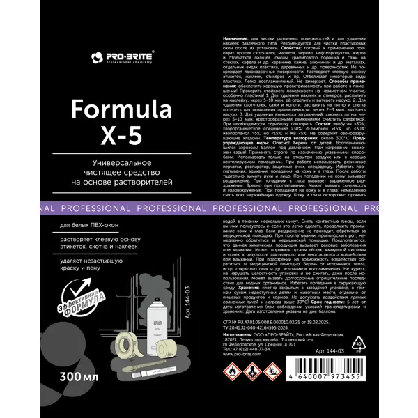 **Универсальное чистящее средство Formula X-5** предназначено для чистки различных поверхностей и для удаления наклеек различного типа. Рекомендуется для чистки пластиковых окон после их установки. **Особенности** - готовый к применению препарат против скотч-клея, маркера, чернил, нефтепродуктов, жиров и отпечатков пальцев, смолы, графитового порошка и сажи на стёклах, кафеле и др. керамике, камне, алюминии и др. металлах, отдельных видах пластика, деревянных и др. поверхностях - не повреждает лакокрасочные поверхности - растворяет клеевую основу этикеток, наклеек, стикеров и пр. - отбеливает некоторые виды пластика - легко воспламеняемый - не замерзает **Применение** Обеспечить хорошую перевариваемость при работе в помещении. Проверить стойкость поверхности на незаметном участке, особенно пластика. 1. Для удаления наклеек и стикеров: распылить на наклейку, через 5-10 мин. её отделить и вытереть насухо. 2. Для удаления скотч-клея, сажи и копоти: распылить на пятно и слегка потере