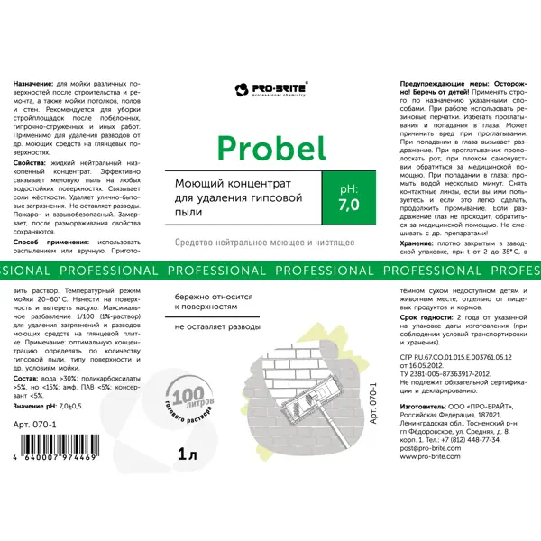 **Концентрат моющий для удаления гипсовой пыли Probel** предназначен для мойки различных поверхностей после строительства и ремонта, а также мойки потолков, полов и стен. Рекомендуется для уборки стройплощадок после побелочных, гипрочно-стружечных и иных работ. Применимо для удаления разводов от др. моющих средств на глянцевых поверхностях. **Особенности** - низкопенный концентрат - эффективно связывает меловую пыль на любых водостойких поверхностях - удаляет улично-бытовые загрязнения - связывает соли жёсткости - не оставляет разводов - пожаро- и взрывобезопасный - замерзает, после размораживания свойства сохраняются **Применение** Использовать распылением или вручную. Приготовить раствор. Температурный режим мойки 20-60°С. Нанести на поверхность и вытереть насухо. Максимальное разбавление 1/100 (1%-раствор) для удаления загрязнений, а также для удаления разводов моющих средств на глянцевой плитке. Оптимальную концентрацию определять по количеству гипсовой пыли, типу поверхности и