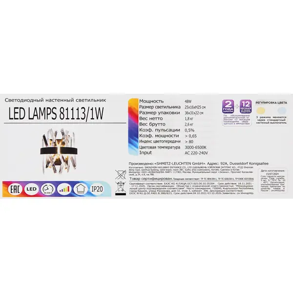| Состав комплекта | Светильник, паспорт, инструкция |