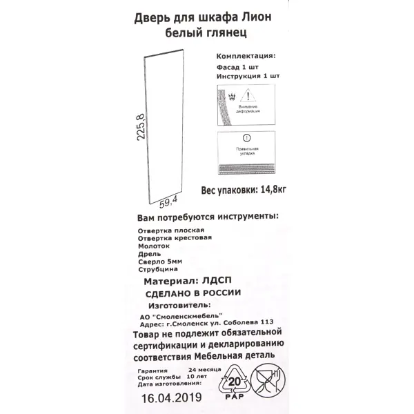 Дверь для шкафа Лион 59.4x225.8x1.6 см ЛДСП цвет белый лак