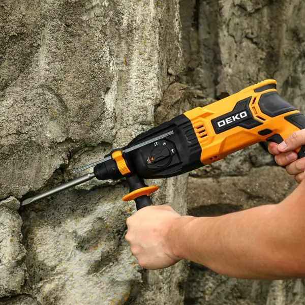 **Перфоратор сетевой SDS-plus Deko ZKH1000W** — удобный в использовании и надежный в работе электроинструмент, рассчитанный на функционирование в трех режимах: сверление, ударное сверление и долбление. Переключение между ними осуществляется посредством тумблера, который находится сбоку на корпусе. С помощью перфоратора можно высверливать отверстия разного диаметра в бетоне, металле и других материалах. Хвостовик типа SDS-plus упрощает и ускоряет процесс замены оснастки. Эргономичная ручка обеспечивает надежный хват и улучшенный контроль. Для большего удобства предусмотрена дополнительная рукоятка. Предусмотрен кейс, который упрощает хранение и транспортировку перфоратора и необходимых аксессуаров. ### Особенности: - мощность инструмента составляет 1050 Вт; - сила удара достигает 3,2 Дж; - максимальное число ударов — 4860 в минуту; - количество оборотов — до 870 в минуту; - тип используемого патрона — SDS Plus; - максимальный диаметр сверления в бетоне составляет 28 мм; - длин