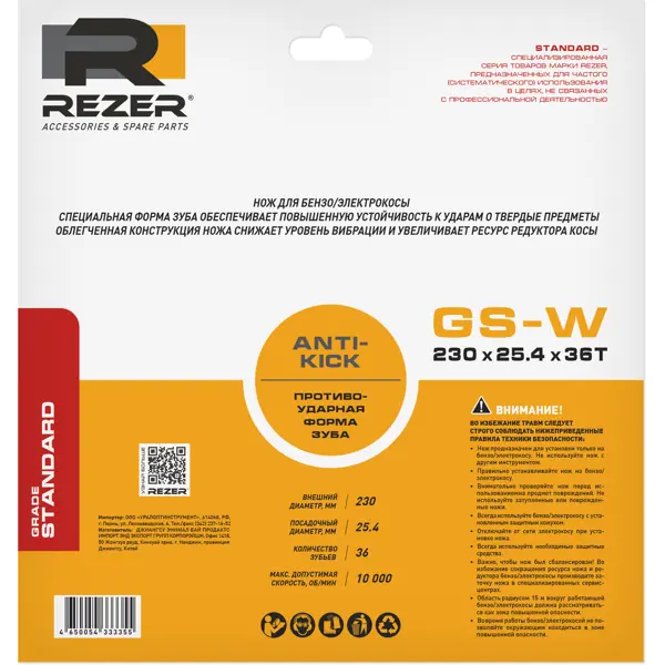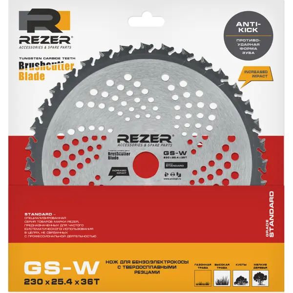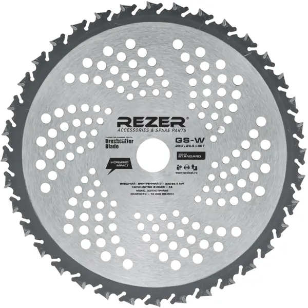 **Диск для кустореза Rezer GS-W** предназначен для профессионального использования. Зубья с твердосплавными резцами обладают высокой устойчивостью к затуплению и длительным сроком службы. Облегченная конструкция снижает уровень вибрации и увеличивает ресурс редуктора триммера. ### Особенности: - внешний диаметр диска — 230 мм; - посадочный диаметр диска — 25,4 мм; - толщина диска — 1,3 мм; - количество зубьев — 36 шт.