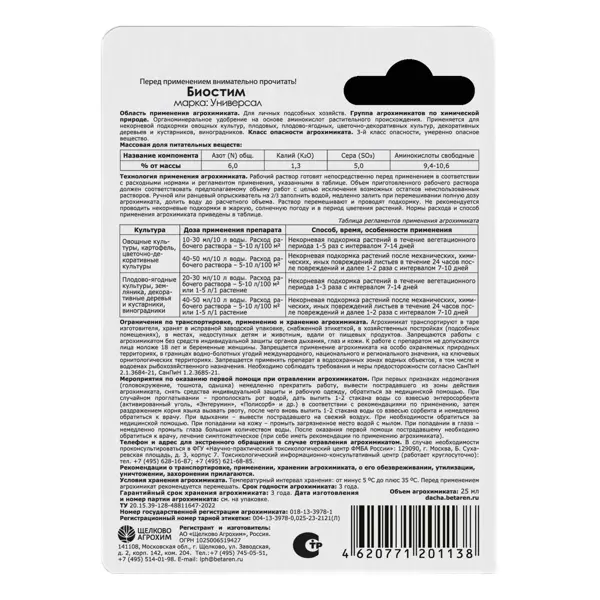 **Стимулятор роста «Биостим Универсал»** — агротехническое средство с минералами, экстрактивными веществами и аминокислотами. Предназначено для некорневой подкормки декоративных и плодовых культур в вегетационный период. Препарат разводится водой в пропорциях, указанных на упаковке, непосредственно перед применением. ### Особенности - Способствует акклиматизации растений. - Ускоряет развитие при неблагоприятных погодных условиях. - Улучшает качество плодов.