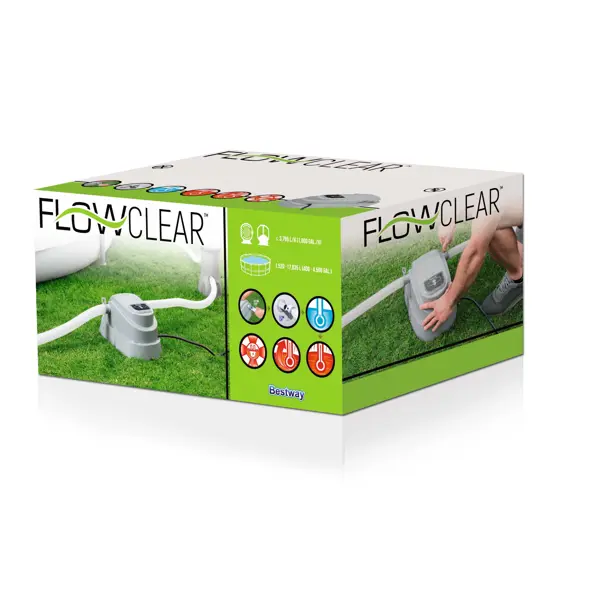 **Водонагреватель проточный «Гейзер»** — электрический прибор мощностью 2800 Вт, предназначенный для нагревания воды в каркасных и надувных дачных бассейнах объемом от 1520 до 17 тыс. литров. Время нагрева на 1 °C составляет от 1 до 10 часов в зависимости от объема жидкости и температуры воздуха. Прибор подключается к фильтрующему насосу с расходом не более 3785 л/ч, работает от бытовой электрической сети с напряжением 220-240 В. **Сохраняйте бюджет и ресурсы планеты.** Водонагреватели с классом энергоэффективности "А" и выше обеспечат вас горячей водой и помогут экономить энергию. ### Особенности водонагревателя - Подходит только для разборных бассейнов. - При благоприятных условиях нагревает воду до 40 °C. - Укомплектован шлангом для присоединения к насосу или песчаному фильтру и хомутом.