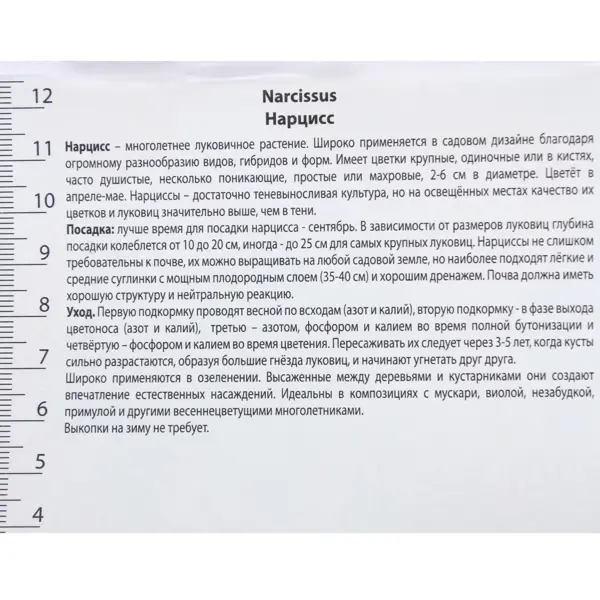 **Нарцисс трубчатый «Стандарт Велью»** - многолетнее луковичное растение. Широко применяется в садовом дизайне благодаря огромному разнообразию видов, гибридов и форм. Цветки крупные, одиночные или в кистях, часто душистые, несколько поникающие, простые или махровые, 2-6 см в диаметре. Для сортов группы Трубчатые нарциссы характерно наличие одного цветка на прочном средней высоты или высоком цветоносе. Основной признак: трубка равна или длиннее доли околоцветника. В группе преобладают белая и желтая окраска цветков. Очень нарядные цветки с разной окраской трубки и околоцветника. Сорта различаются по текстуре долей околоцветника, форме трубки, высоте цветоноса, времени и продолжительности цветения. У трубчатых нарциссов луковицы крупные, большинство сортов хорошо размножаются. Широко рекомендуются для ландшафтного оформления, срезки, выгонки. **Месторасположение:** нарциссы - культура более теневыносливая по сравнению, например, с тюльпанами, но на освещенных местах “урожай” их цв