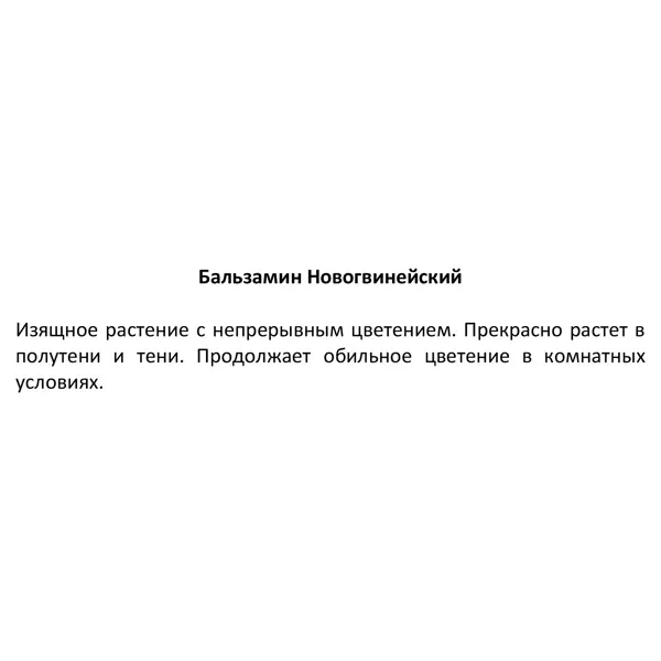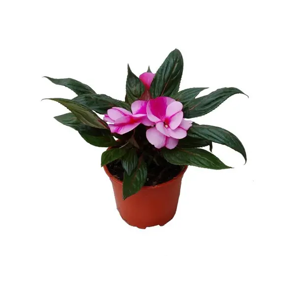 **Бальзамин Новогвинейский** - цветущее растение, которое одинаково хорошо себя чувствует как в комнатных горшках, так и на улице в вазонах и подвесных кашпо, на клумбах. Формирует множество гладких стеблей, на которых располагаются овальной или ланцетовидной формы листья. Окраска - от темно-зеленого до бордового. Бутоны обладают лепестками с махровой поверхностью розового или красного оттенка. ### Особенности: - грунт должен быть легким и рыхлым с обязательной укладкой дренажа на дно емкости; - оптимальная температура выращивания - 25°C; - освещение растение предпочитает яркое, но рассеянное; - полив осуществляют регулярно; - влажность поддерживают на среднем уровне, рядом можно поставить емкость с водой; - для подкормки 1 раз в 2 недели применяют калийные или фосфорные подкормки; - размеры растения в товарной упаковке составляют 13 х 17 см.