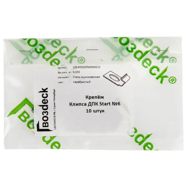 **Клипса для ДПК Гвозdeck No6** применяется при устройстве террасной и палубной доски. Она подходит для отделочных материалов любой ширины и любых профилей, которые имеют пазы на боковой стороне. Для монтажа требуется только один потайной саморез. Деталь обеспечивает компенсацию разбухания и усушки доски, при этом ее ширина не имеет значения. Клипса производится из стали. Материал изделия отличается прочностью, стойкостью к механическим повреждениям, воздействиям окружающей среды. Покрытие цинком делает клипсу крепче, предотвращает образование коррозии. ### Особенности: - удобный монтаж; - количество — 10 шт.