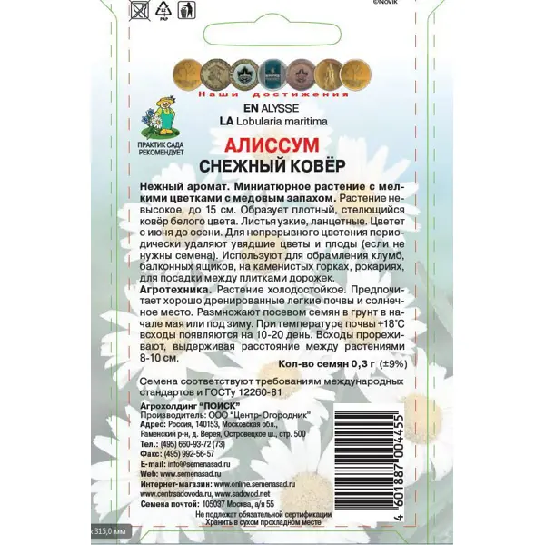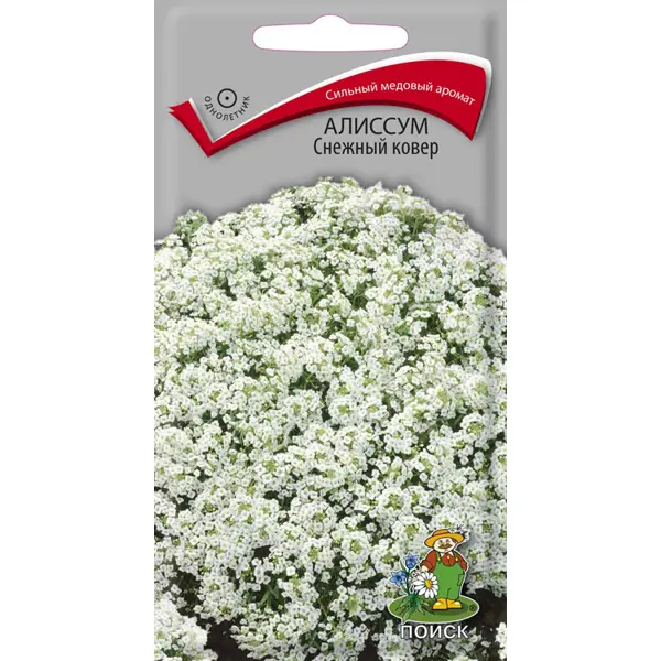 **Семена цветов Поиск алиссум Снежный ковер** — миниатюрное, компактное растение, высота которого не превышает 15 см. Цветы отличаются приятным медовым ароматом. Формирует плотный белый ковер. Листочки узкие. Хорошо откликается на санитарную обрезку — формирует новые бутоны. Растение предназначено для украшения рокариев, клумб, балконных ящиков. ### Особенности: - характеризуется устойчивостью к заморозкам; - для высадки следует выбирать легкие грунты и достаточно освещенные участки; - семена сеют под зиму или в открытый грунт в первой половине мая; - после образования всходов требуется провести прореживание.
