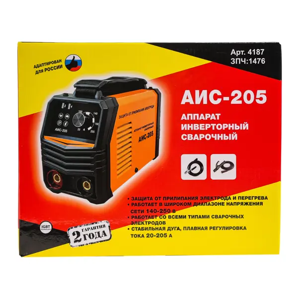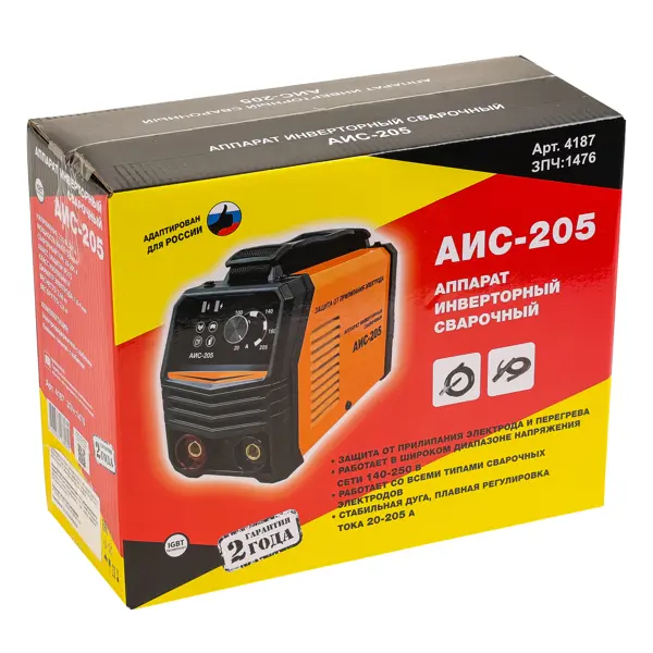 **Сварочный аппарат АИС-205** — один из самых бюджетных и миниатюрных на российском рынке. Подходит для бытовых работ дома, на даче, в гараже, а также в небольших мастерских. Аппарат выполнен в корпусе из цельного стального листа с защитой класса IP21 (защищён от вертикального попадания капель воды). Для удобства переноски предусмотрен широкий регулируемый ремень. ### Преимущества: - Встроенная защита от перегрева и от залипания электрода; - Работа при пониженном напряжении (от 140 Вольт); - Небольшой вес, компактные размеры.