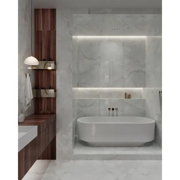 **Глазурованный керамогранит Arcadia Ceramica Onyx White Cloud** — это воплощение природной красоты, заключенной в современных материалах. Его уникальная текстура и нежные бежевые оттенки напоминают о великолепии натурального оникса, создавая атмосферу уюта и гармонии в любом интерьере. Плавные линии рисунка перетекают друг в друга, придавая пространству динамику и легкость, что способствует созданию теплой и живой обстановки. Гладкая глянцевая поверхность не только красиво отражает свет, но и создает атмосферу простора и уюта. Использование этого керамогранита в интерьере помогает визуально расширить пространство и добавить глубину. **Onyx White Cloud** – идеальное решение для тех, кто стремится создать уютный интерьер без потери элегантности.