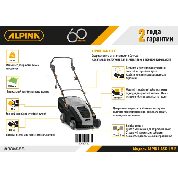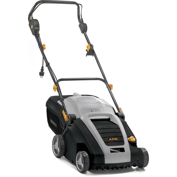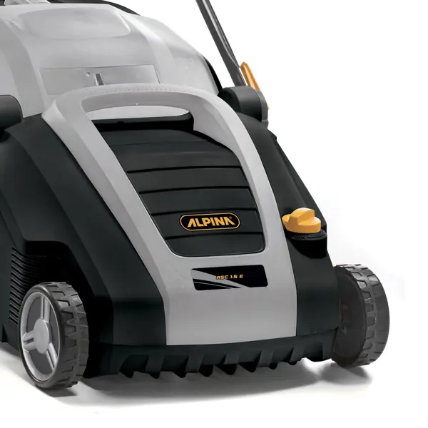 **Аэратор электрический Alpina** предназначен для ухода за газоном площадью до 600 м². Аппарат удаляет высохший дерн и прорезает борозды, которые улучшают циркуляцию воздуха и облегчают проникновение влаги в грунт. Ширина захвата составляет 380 мм. Приводом служит мощный и надежный щеточный двигатель на 1500 Вт, питающийся от бытовой сети переменного тока с напряжением 220 В. Комплект поставки включает два вала: один с 20 ножами для разрезания кочек, второй — с 44 пружинными элементами для вычесывания травы и мха. Вес модели — 14 кг. ### Особенности - Вместительный (50 л) и прочный пластиковый контейнер для сбора травы. - Складная регулируемая рукоятка с защитой от случайного пуска. - Большие колеса улучшают маневренность модели. - Центральная регулировка: поменять высоту и включить транспортировочный режим можно одним движением.