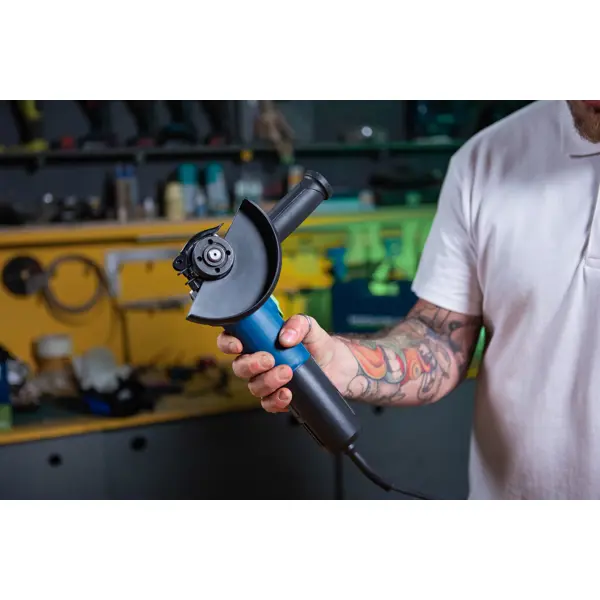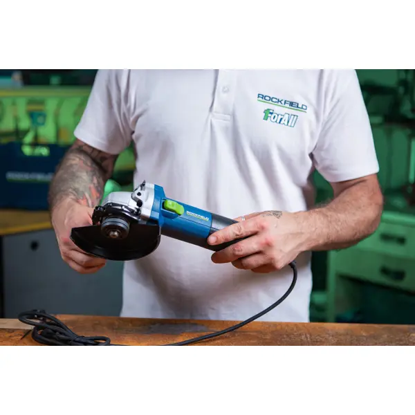 **Углошлифовальная машина сетевая Rockfield** оснащена щеточным двигателем мощностью 750 Вт и предназначена для обработки сварных швов, заготовок из камня, бетона, металла. Диаметр шлифовального круга — 125 см. Основная и дополнительная (с мягким захватом) рукоятки способствуют удобному удержанию инструмента и точности манипуляций. Предусмотрена блокировка шпинделя при заклинивании диска. Съемный защитный кожух предупреждает попадание стружки и пыли на мастера. ### Особенности: - модель — RF75AG; - число оборотов двигателя — 11000 об/мин; - назначение — для домашней мастерской; - без плавного пуска; - скользящий переключатель включения/выключения; - быстросменный предохранитель; - переменная скорость; - длина сетевого провода — 3 м; - комплектация — угловая шлифовальная машина RF75AG, вспомогательная рукоятка — 1 шт., ключ — 1 шт.; защитный кожух — 1 шт., пара угольных щеток — 1 комплект, коробка. **БЕРЕЖНО К ЛЮДЯМ, БЕРЕЖНО К ПРИРОДЕ** - Этот товар имеет бесплатную расширенную гаран