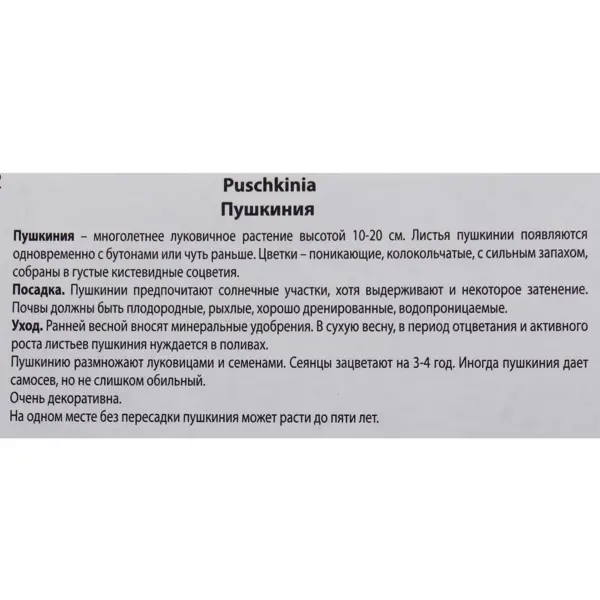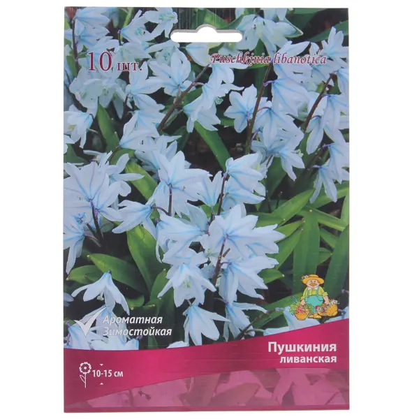 **Пушкиния ливанская** - многолетнее луковичное растение высотой 10-20 см. Листья пушкинии появляются одновременно с бутонами или чуть раньше. Цветки – светло-голубые, поникающие, колокольчатые, с сильным запахом, собраны в густые кистевидные соцветия. Высота растения 10-15 см. **Посадка:** Пушкинии предпочитают солнечные участки, хотя выдерживают и некоторое затенение. Почвы должны быть плодородные, рыхлые, водопроницаемые. **Уход:** Ранней весной вносят минеральные удобрения. В сухую весну, в период отцветания и активного роста листьев пушкиния нуждается в поливах. Пушкинию размножают луковицами и семенами. Сеянцы зацветают на 3-4 год. Иногда пушкиния дает самосев, но не слишком обильный. На одном месте без пересадки пушкиния может расти до пяти лет. **Категория:** Пушкиния