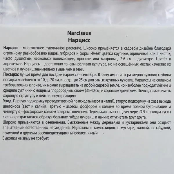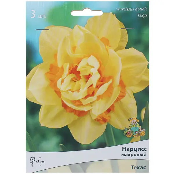 **Нарцисс махровый «Техас»** - многолетнее луковичное растение. Широко применяется в садовом дизайне благодаря огромному разнообразию видов, гибридов и форм. Цветки крупные, одиночные или в кистях, часто душистые, несколько поникающие, простые или махровые, 2-6 см в диаметре. Сорта группы Махровые нарциссы выделяются махровыми цветками от одного до нескольких на цветоносе. Это самая популярная группа в любительском садоводстве. Махровые сорта отличаются формой цветков, их размерами и окраской. Высота растений от 15 до 45 см. **Месторасположение:** нарциссы - культура более теневыносливая по сравнению, например, с тюльпанами, но на освещенных местах “урожай” их цветков и луковиц значительно выше, чем в тени. **Почва:** мирятся с любой почвой, при условии, что она хорошо дренирована и плодородна. На одном месте могут оставаться 3-5 лет. **Посадка:** высаживать луковицы следует на глубину 15-20 см на расстоянии 10-12 см друг от друга. Лучшее время для посадки луковиц нарциссов август -