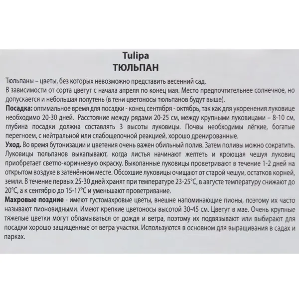 **Тюльпан махровый поздний «Миранда»** - многолетнее травянистое луковичное растение семейства лилейных. Пользуется широкой популярностью и распространено во всех странах с умеренным климатом. Тюльпаны являются наиболее красивоцветущими среди весенних цветов и к тому же относительно неприхотливы в культуре. Махровые поздние тюльпаны имеют густомахровые цветы, внешне напоминающие цветы пионов, поэтому их часто называют пионовидными. Махровые поздние тюльпаны имеют крепкие цветоносы высотой 45-60 см. От Махровых ранних эти тюльпаны отличаются более крупными размерами всего растения и поздним сроком цветения. Махровые поздние тюльпаны имеют один недостаток: их тяжелые цветки часто обламываются от дождя и ветра. Это нужно учитывать при посадке таких тюльпанов и отводить им хорошо защищенные участки или подвязывать. Окраска тюльпанов этого класса варьируется от чисто-белой до черной, может быть и двухцветной. Используются в основном для выращивания в садах и парках. Размножаются они доволь
