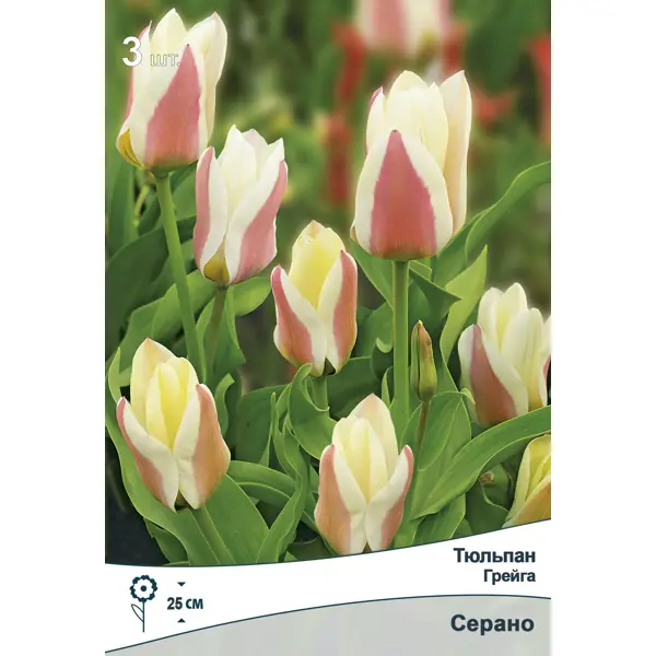 **Тюльпан Грейга Серано** — это яркоцветущий, неприхотливый сорт. Растение достигает высоты 25 см, имеет кремово-белые цветки с нежно-розовым пламенем. Бокальчики необычайно хороши как в закрытом, так и в распустившемся виде. Место для посадки должно быть открытым и солнечным, с хорошей защитой от ветров. Допускается выращивание при легком затенении. Почва подойдет практически любая, но лучшим вариантом считается легкий песчаный или суглинистый грунт с нейтральной реакцией. Для цветов недопустим застой паводковых и грунтовых вод, что может отрицательно сказаться на корневой системе. Почву готовят заранее — за пару недель до посадки. Ее глубоко перекапывают, после чего вносят перегной или другое удобрение. Кислую почву известкуют доломитовой мукой. Тюльпаны высаживают на глубину 2-3 диаметра луковицы. После посадки необходимо организовать своевременный полив в умеренном количестве. Он особенно важен во время бутонизации и цветения культуры. Весной после появления всходов грунт вокруг тю