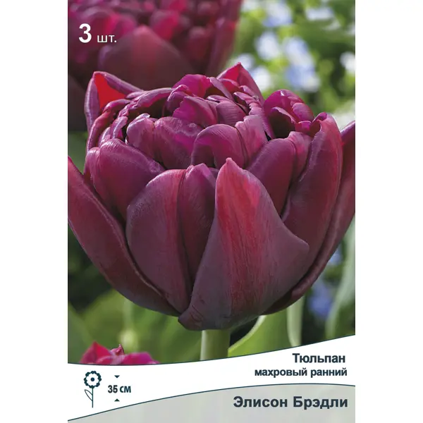 **Тюльпан махровый ранний Элисон Брэдли** — это красивый сорт с яркими насыщенно-фиолетовыми цветами. Растение достигает высоты 35 см. Место для посадки должно быть открытым и солнечным, с хорошей защитой от ветров. Допускается выращивание при легком затенении. Почва подойдет практически любая, но лучшим вариантом считается легкий песчаный или суглинистый грунт с нейтральной реакцией. Для цветов недопустим застой паводковых и грунтовых вод, что может отрицательно сказаться на корневой системе. Почву готовят заранее — за пару недель до посадки. Ее глубоко перекапывают, после чего вносят перегной или другое удобрение. Кислую почву известкуют доломитовой мукой. Тюльпаны высаживают на глубину 2-3 диаметра луковицы. После посадки необходимо организовать своевременный полив в умеренном количестве. Он особенно важен во время бутонизации и цветения культуры. Весной после появления всходов грунт вокруг тюльпанов рыхлят — это поможет открыть доступ кислорода к корням растения. За вегетационный п